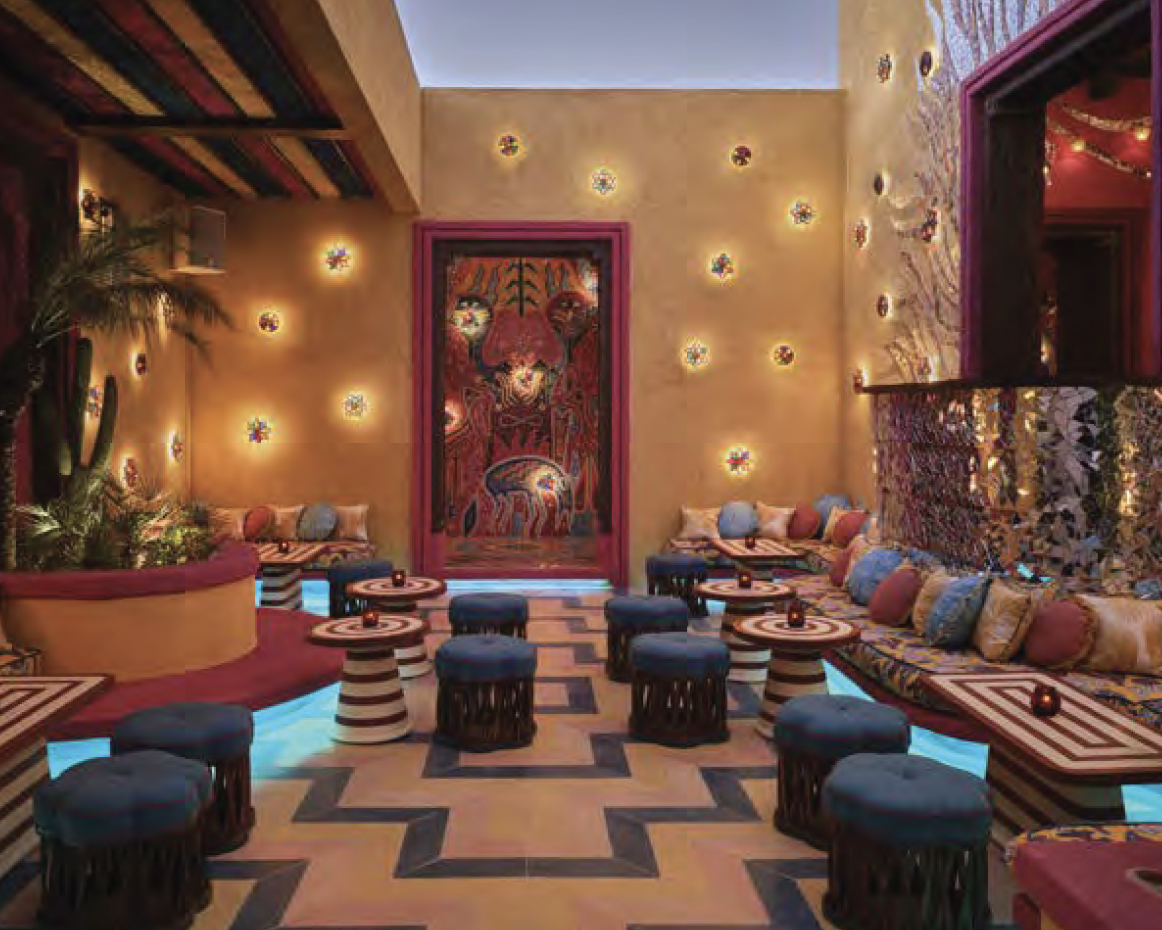 The speakeasy aesthetic offers a variety of seating experiences, including intimate booths designed for relaxing before or after hitting the dance floor, as well as outdoor seating in a central courtyard. Everywhere, murals and mosaics bring the walls to life in a deeply rooted Mexican style.